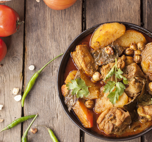 mit Kartoffeln, Karotten, Zwiebeln und Erdnüssen. Enthält Spuren Fischsoße.